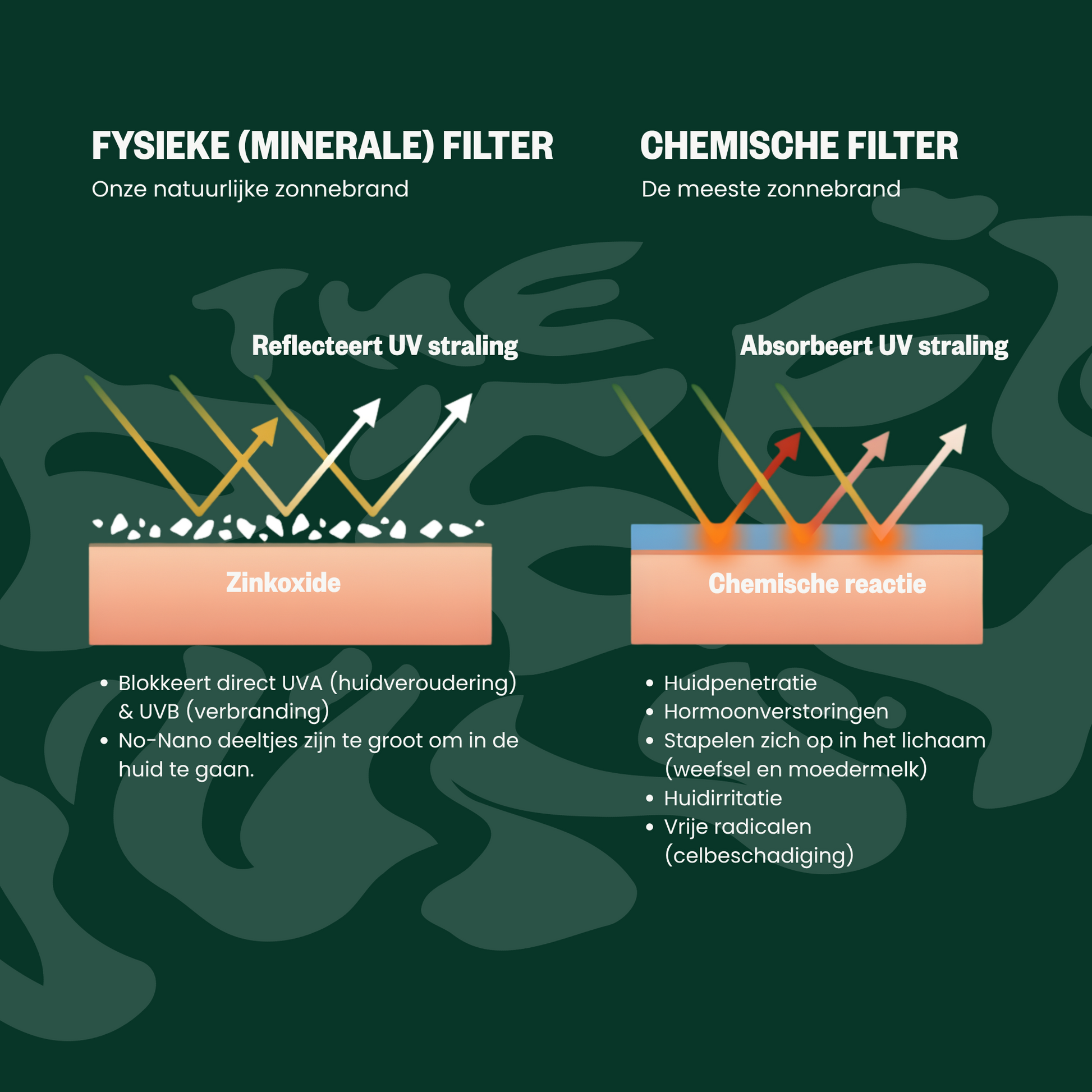 Het grote verschil is de werking: de meeste zonnebrandcrèmes gebruiken chemische filters die in de huid trekken en uv-straling absorberen, wat irritatie of hormoonverstoring kan veroorzaken. Onze natuurlijke zonnebrand met zinkoxide werkt als een onzichtbaar schild dat de straling direct reflecteert. Hierdoor krijg je geen toxic chemicaliën op en in jouw lichaam.